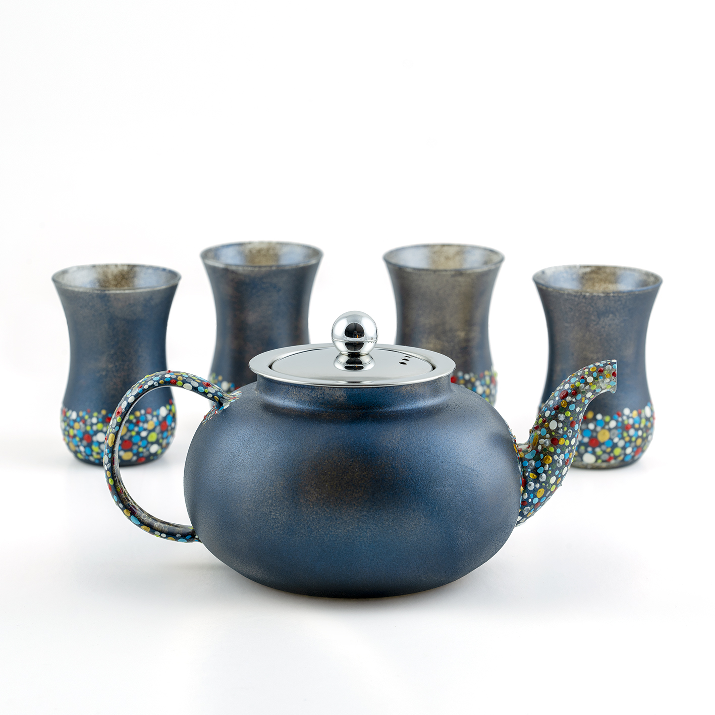 Γυάλινη τσαγιέρα των 250ml σετ με τέσσερα γυάλινα ποτηράκια…όλα ζωγραφισμένα στο χέρι με σμάλτα μη τοξικά και ψημένα στους 160 βαθμούς κελσίου. Το συγκεκριμένο σχεδιο έχει ανάγλυφη υφή. Συστήνεται πλύσιμο στο χέρι προκειμένου να διατηρηθεί η ζωντάνια των χρωμάτων.
